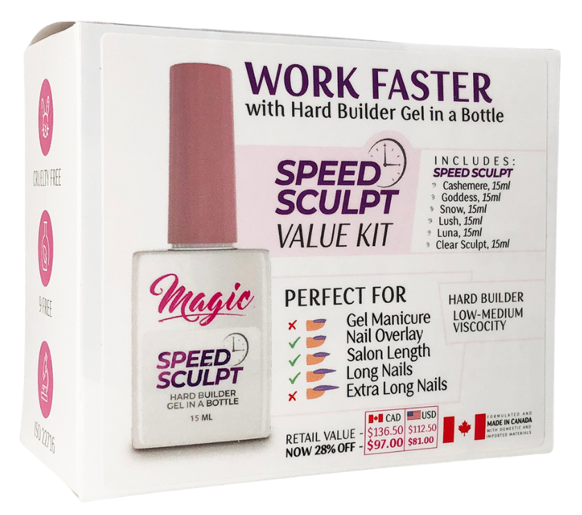 Magic SpeedSculpt Snow is a Hard Gel Builder in a Bottle that allows you to provide all lengths of nails, plus it is conveniently packed in a bottle, with a premium brush, for faster application.